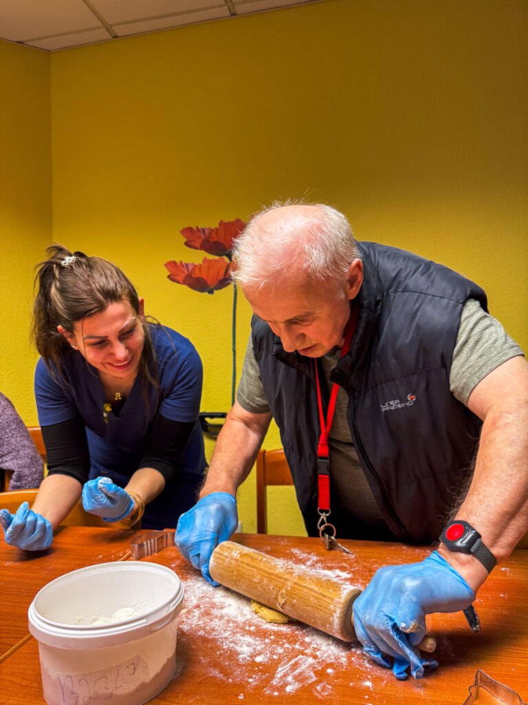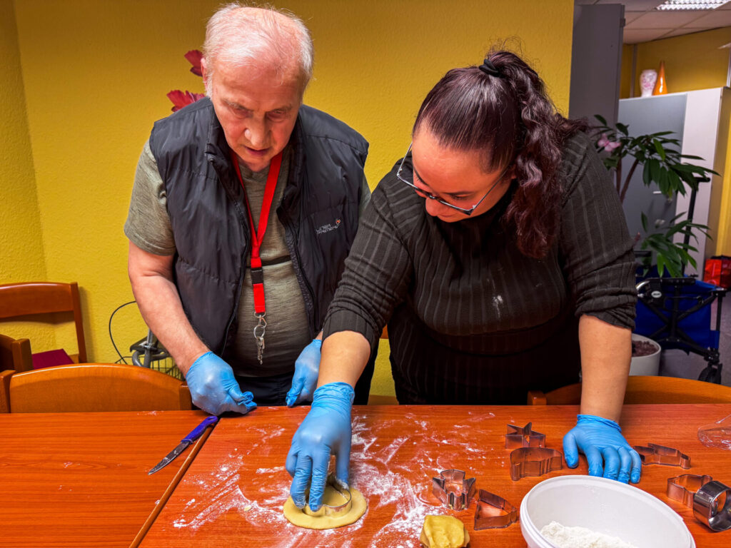 Die Bewohnerinnen und Bewohner rollten den Teig aus, suchten ihre Lieblingsförmchen aus und stachen Sterne, Herzen und klassische Weihnachtsmotive aus. Danach wurden die Plätzchen mit Ei bestrichen und mit bunten Zuckerstreuseln verziert. Während der Backaktion kamen Erinnerungen an frühere Weihnachtsfeste hoch – und es wurde viel gelacht.